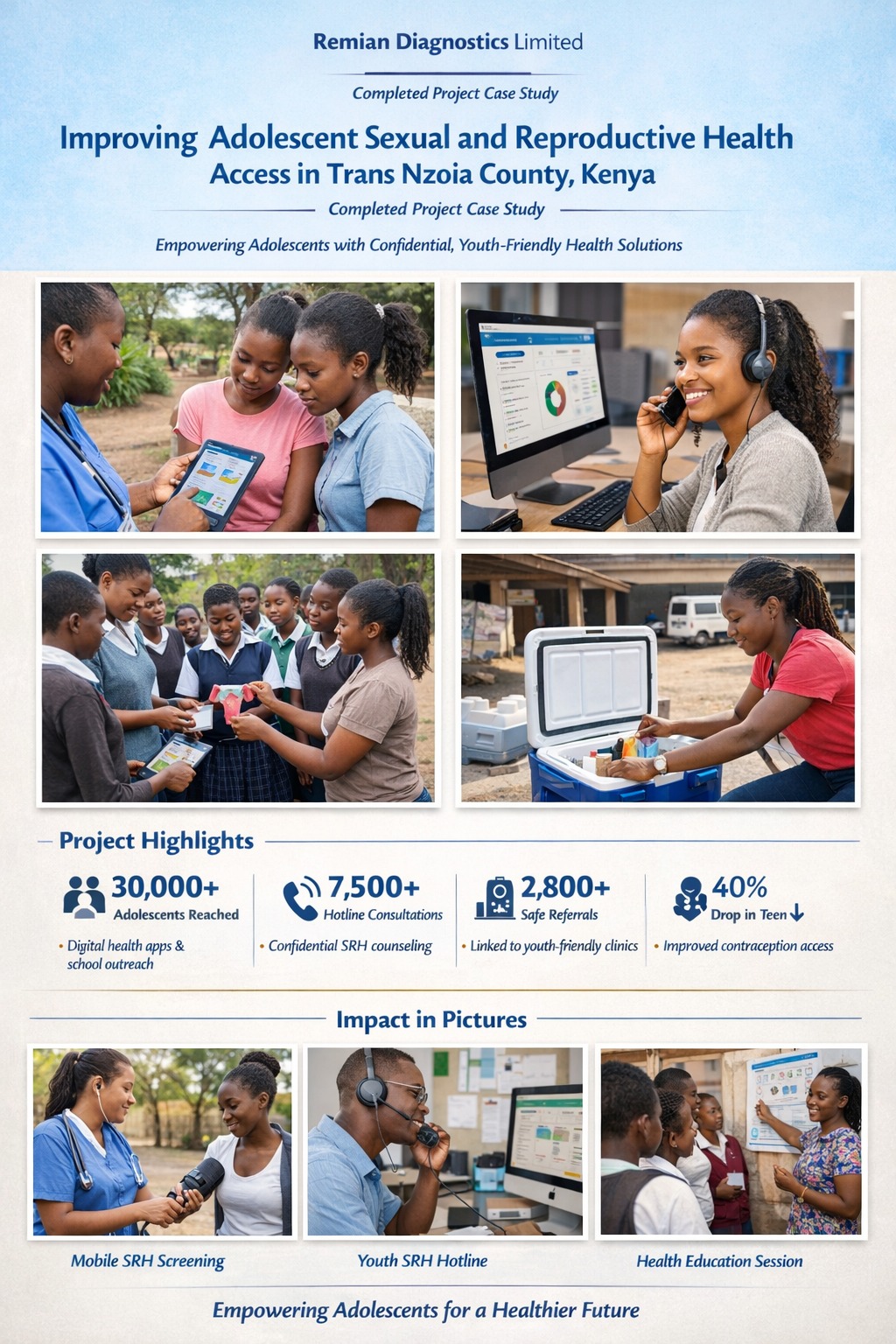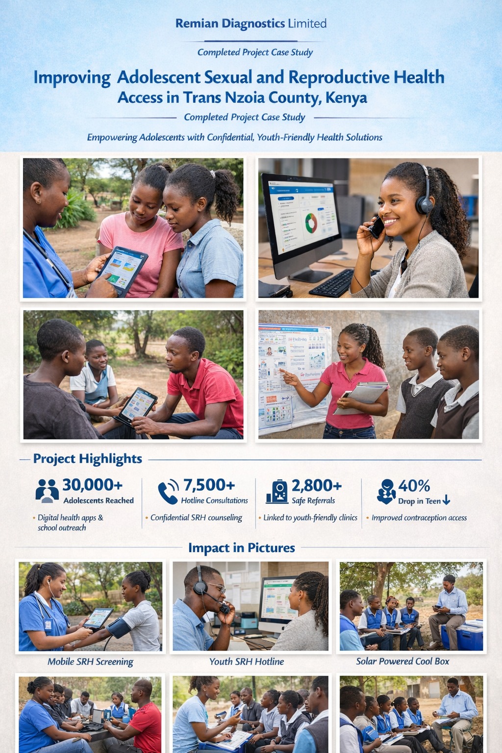 Between May and October 2025, Remian Diagnostics Limited successfully implemented a community-driven, digitally enabled adolescent sexual and reproductive health (ASRH) program in Trans Nzoia County.